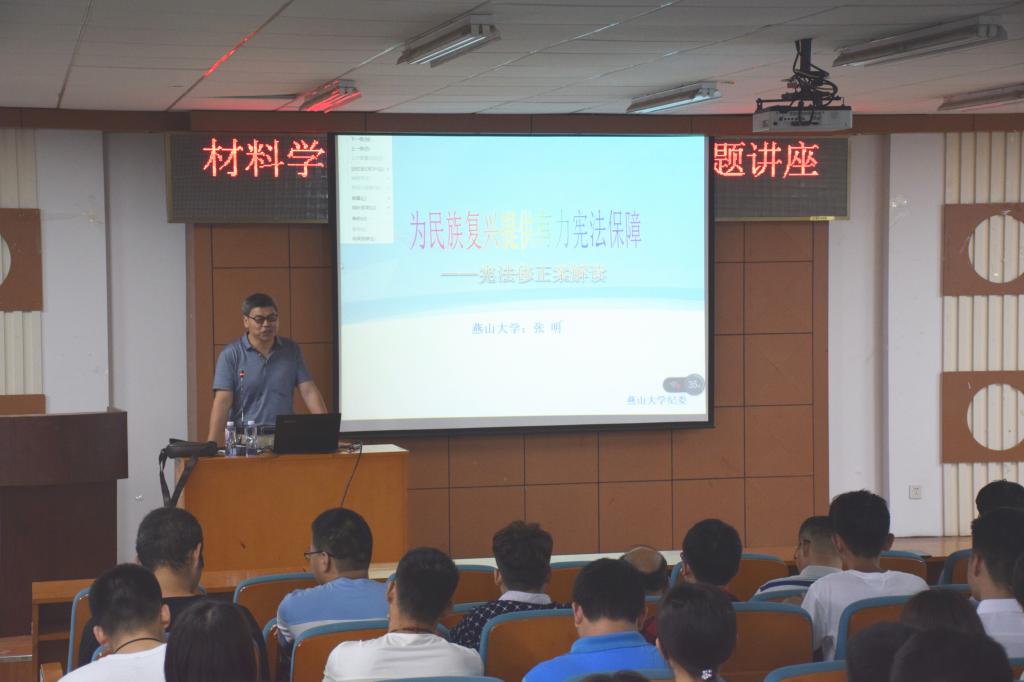 邀请校党委讲师团成员、校纪委副书记、监察审计处处长张明教授,在电院101室作了《为民族复兴提供有力宪法保障——宪法修正案解读》的专题讲座。讲座由日本a片党委书记王丽萍主持。日本a片全体党员师生聆听了本场讲座。