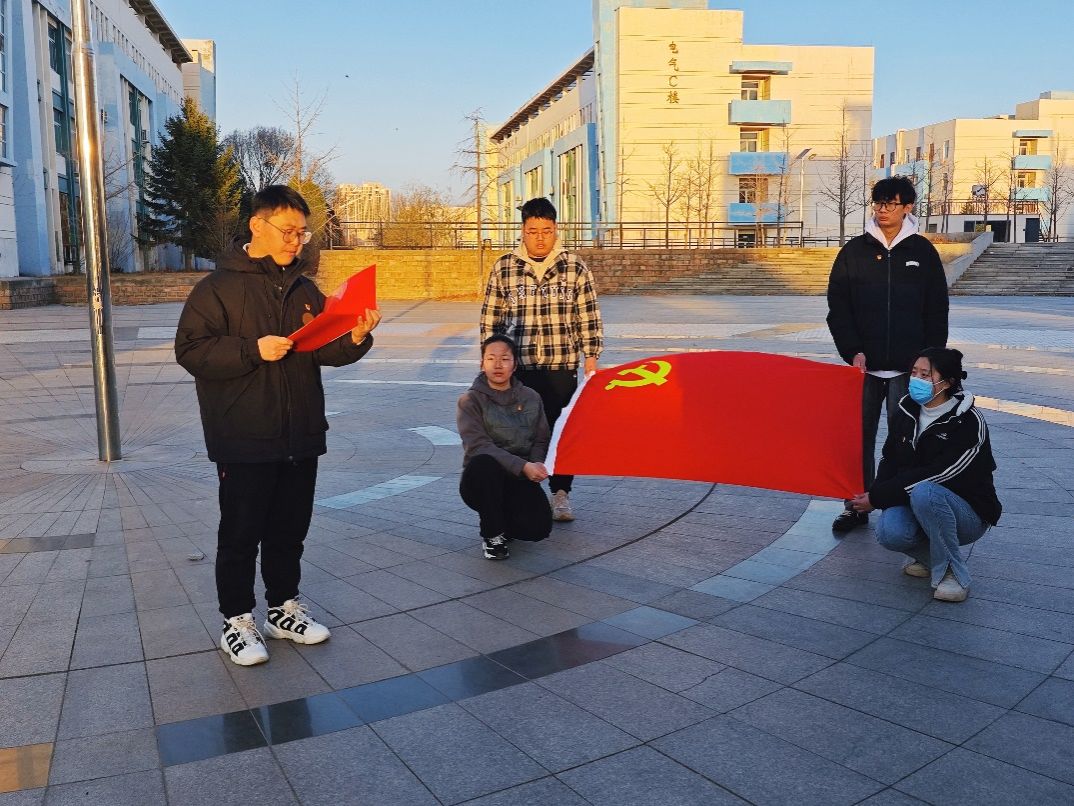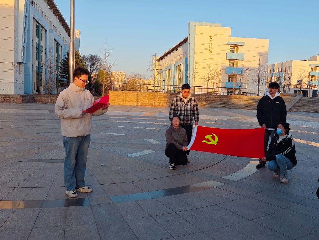 国旗护卫队昂首挺胸,迈着铿锵有力的步伐,护卫着鲜艳的五星红旗走向旗杆。伴随着中华人民共和国国歌,鲜艳的五星红旗在空中冉冉升起。现场全体党员深情地向国旗行注目礼,表达对党和祖国的忠诚与热爱。“我志愿加入中国共产党,拥护党的纲领….随时准备为党和人民牺牲一切,永不叛党。”在王妍的领誓下,全体新党员整齐列队,面向鲜红的党旗,佩戴党员党徽,握紧右拳,语气坚定、声音激昂地进行了庄严的宣誓。
