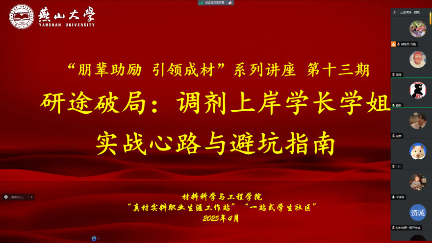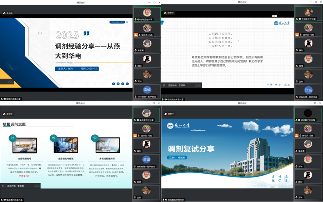 “朋辈助励 引领成材”系列讲座之“研途破局:调剂上岸学长学姐实战心路与避坑指南”于2025年4月3日晚7点准时通过腾讯会议线上平台开讲。2021级计划调剂学子参加会议,会议由2021级辅导员冯晶主持。