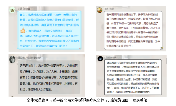 硕士研究生第三党支部全体党员出席会议,张贺贺同志主持,开展“尺笔丹心、‘疫’线先锋”系列主题党日活动。会议中,全体党员同志首先阅读《习近平给北京大学援鄂医疗队全体90后党员回信》并发表看法,随后分享了各自“宅家抗疫”的精彩事迹。